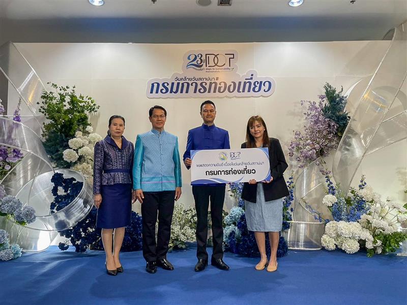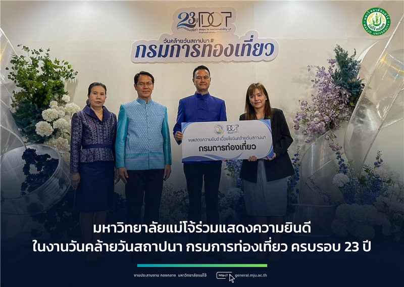 วันพฤหัสบดีที่ 28 สิงหาคม 2568 รองศาสตราจารย์ ดร.วีระพล ทองมา อธิการบดีมหาวิทยาลัยแม่โจ้ มอบหมายให้ นางตรีรัตน์ มาร์คว๊าร์คเสน หัวหน้างานประสานงาน (กรุงเทพฯ) กองกลาง เป็นผู้แทนมหาวิทยาลัยเข้าร่วมแสดงความยินดี ในงานวันคล้ายวันสถาปนา กรมการท่องเที่ยว ในโอกาสครบรอบ 23 ปี ณ กรมการท่องเที่ยว ศูนย์ราชการเฉลิมพระเกียรติ 80 พรรษา อาคารรัฐประศาสนภักดี กรุงเทพฯ