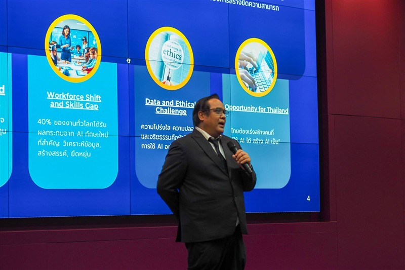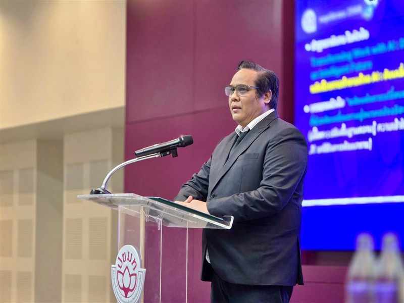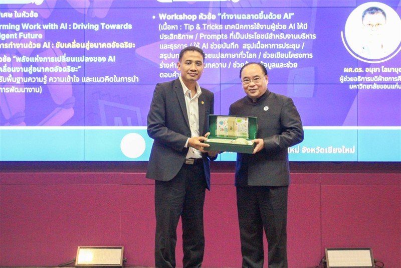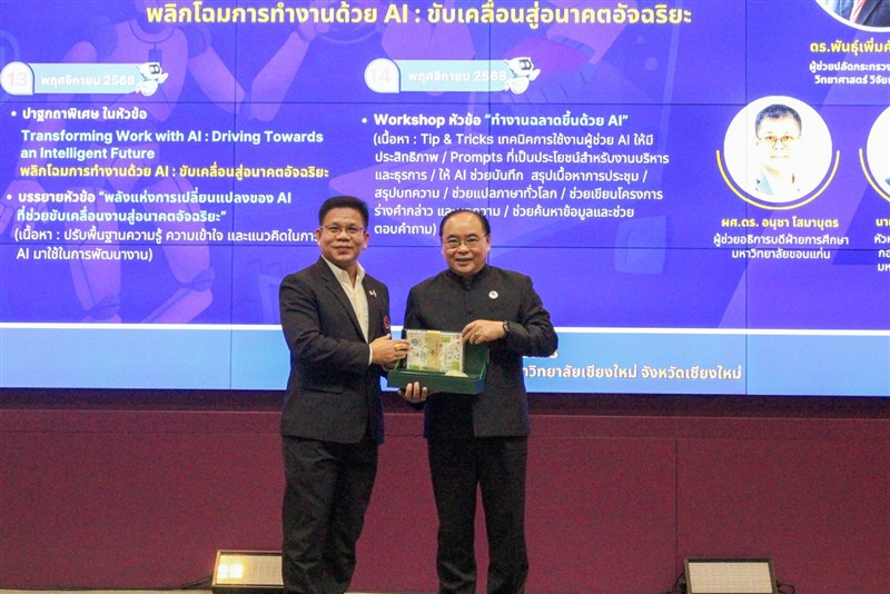 วิจัยและนวัตกรรม เป็นประธานกล่าวเปิดและปาฐกถาพิเศษ หัวข้อ "Transforming Work with AI: Driving Towards an Intelligent Future" หรือ “พลิกโฉมการทำงานด้วย AI: ขับเคลื่อนสู่อนาคตอัจฉริยะ , รองศาสตราจารย์ ดร.วีระพล ทองมา อธิการบดีมหาวิทยาลัยแม่โจ้ กล่าวต้อนรับ และ นายเรวัต รัตนกาญจน์ ประธานที่ประชุมสภาข้าราชการ พนักงานและลูกจ้าง มหาวิทยาลัยแห่งประเทศไทย (ปขมท.) กล่าวรายงาน ณ สำนักบริการวิชาการ มหาวิทยาลัยเชียงใหม่ จังหวัดเชียงใหม่